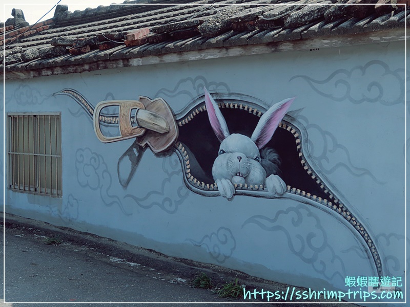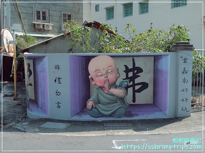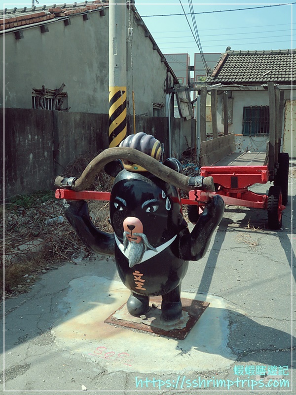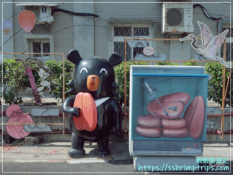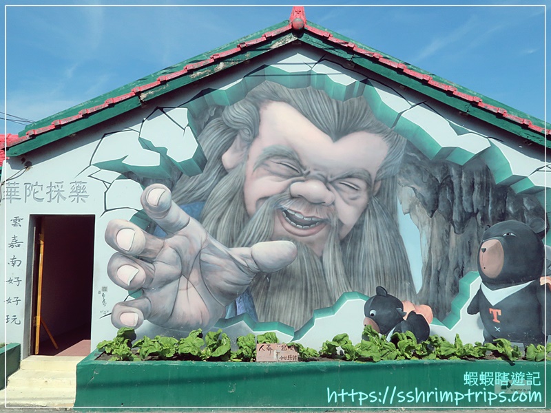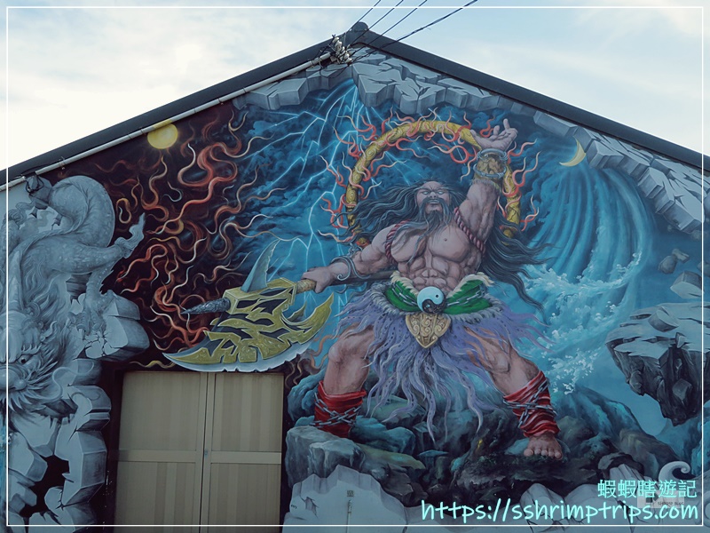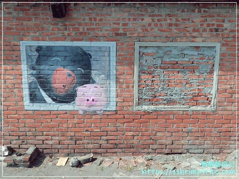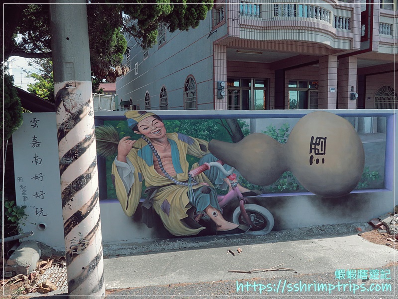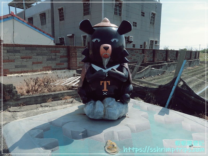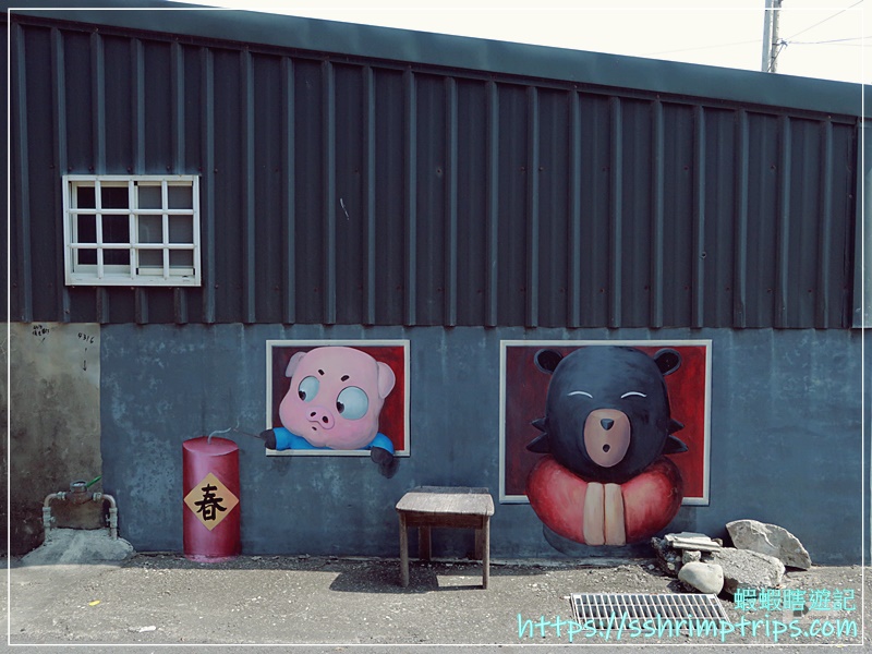 這裡的彩繪主題圍繞在當地特產與鄉村常見的宗教文化,像是台灣觀光吉祥物「喔熊」手中拿著烏魚子,十分呼應地方特色,畢竟距離這裡約1公里的口湖鄉,是全國烏魚子養殖量最多的鄉鎮。
