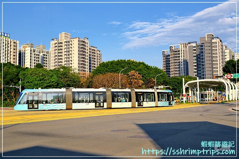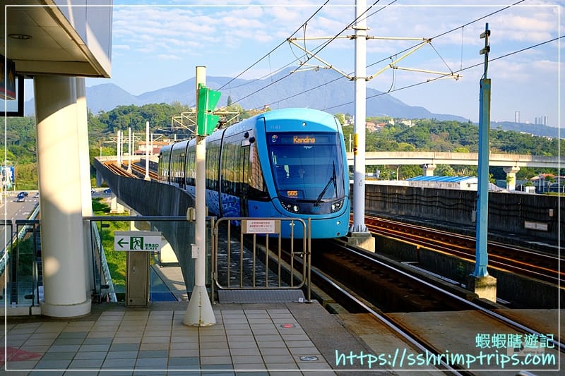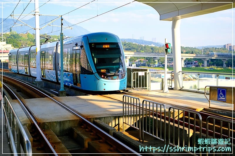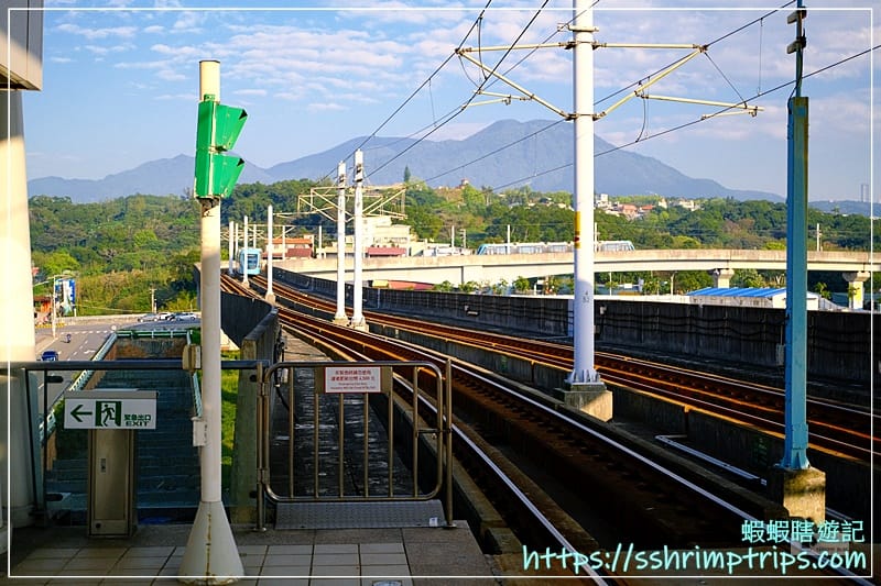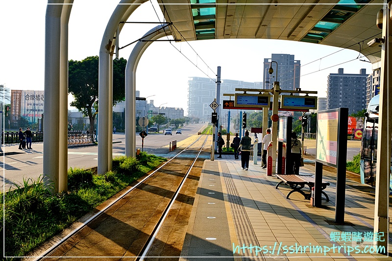 這一站採高架設計,視野相當開闊,軌道筆直延伸至遠方,還能看見列車駛進駛出,對於初次搭乘輕軌的蝦先生而言,充滿著新奇。